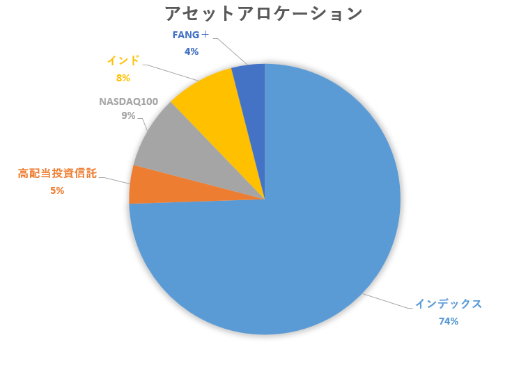 2026年現在のポートフォリオとアセットアロケーションです。メイン投資はインデックスなので7割くらいあります。現在株式資産がある程度あるため今後は高配当系を買い増ししていきます。