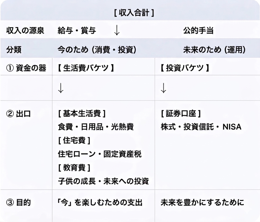 • 収入の柱: 給与と賞与。これを生活の基盤とします。