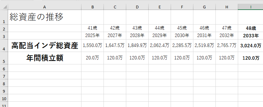 以前ポートフォリオを確認したのが2025年11月総資産が1,550万円でした。年利5%で年間120万円積立をした場合で2033年48歳で3,000万突破の計算でした。(2025年は11月で積立枠残り20万でした)